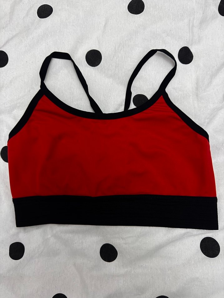 Kırmızı renkte, ince siyah askılı ve siyah bantlı spor sütyen. Streetwear ve athleisure tarzlarına uygundur, desensiz sade tasarım. ♀️marka temsilidir.