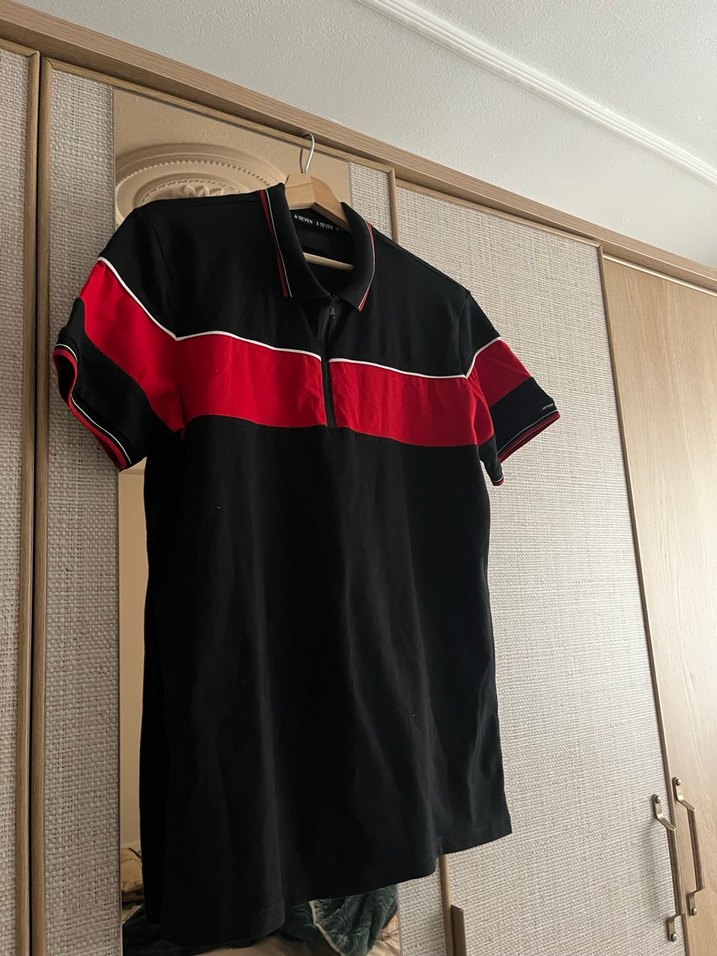 Kırmızı ve siyah baskılı, düğmeli önlü, kısa kollu, yakalı ve vücuda oturan erkek polo tişörtü. Sentetik kumaştan, günlük rahat sokak stili için uygun.