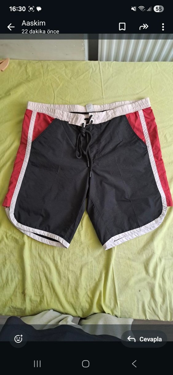 Belden bağlamalı, bol kesim erkek şort. Sentetik kumaştan üretilmiş, koyu kırmızı ve siyah renklerde, beyaz şerit detaylıdır. Plaj ve sokak stiline uygundur.