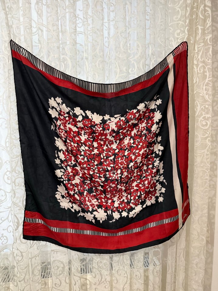 Drapeli, kırmızı ve siyah renklerde çiçek desenli tekstil kumaştan bohem tarzda kadın fularıdır.