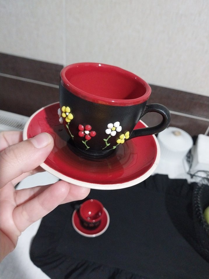 Seramik fincan ve tabağın dışı koyu renk, üzerinde renkli çiçek desenleri bulunur. İç kısmı ve tabağı canlı kırmızı renktedir. ☕