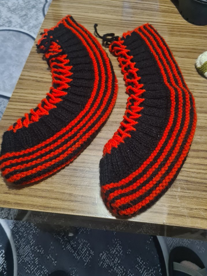 kırmızı siyah çizgili el örgüsü bayan uzun patik