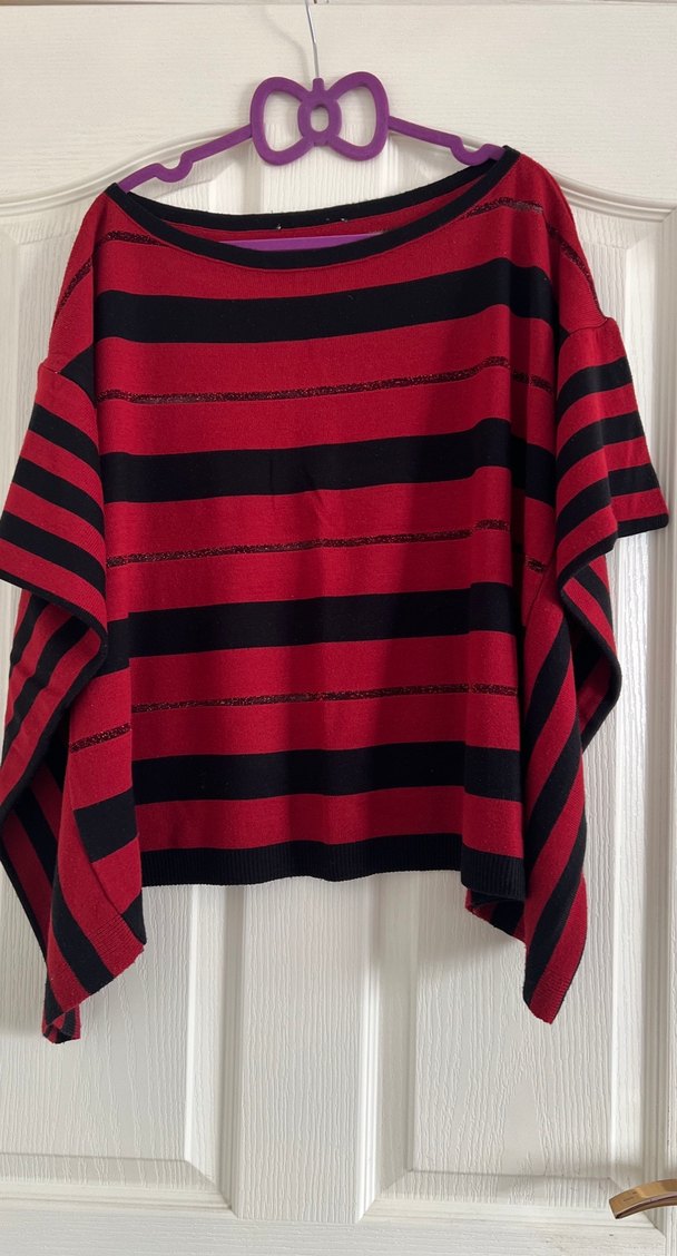 Kadınlar için kayık yaka, uzun kollu ve bol kesim triko. Koyu kırmızı-siyah çizgili, sentetik yumuşak kumaştan örülmüştür, rahat sokak stili için uygundur.