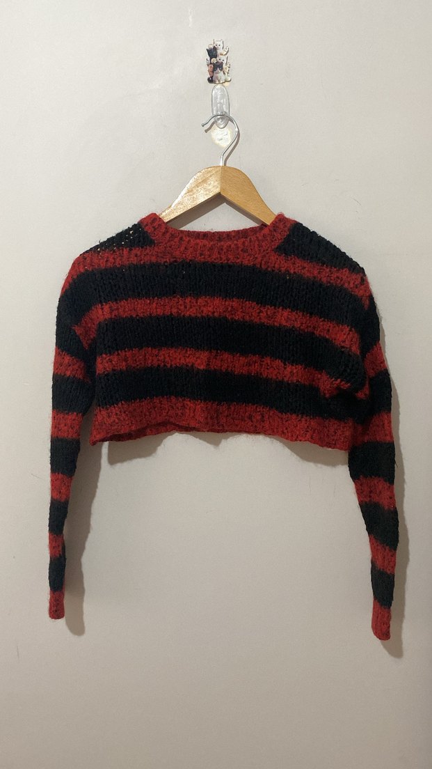 Kırmızı Siyah Çizgili Örgü Crop Kazak