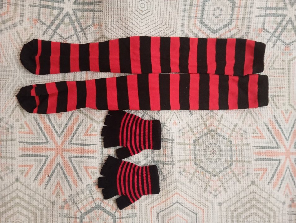Kırmızı ve siyah çizgili, örgü goth tarzı parmakları açık eldivenler,ve çorap rahat ve rock punk havası için uygundur. Sıcaklık ve tarz sunar.