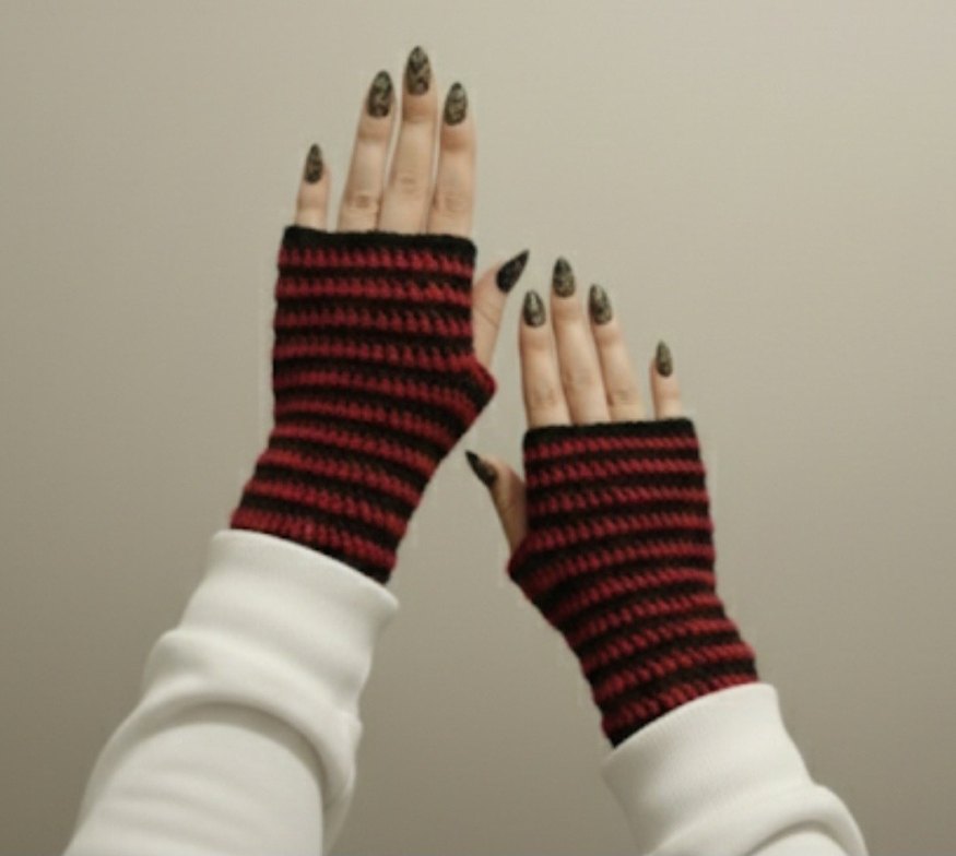 GÖRSEL BANA AİTTİR ✔️ İLAN AÇIYORUM Kırmızı ve siyah çizgili, örgü parmakları açık eldivenler; rahat ve gotik punk tarzını bir araya getirir.
