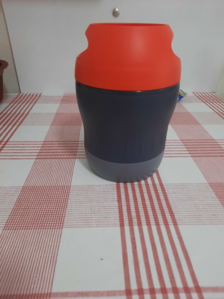 Koyu gövdesi ve canlı kırmızı kapağı olan çocuk termos şişesi, içecekleri sıcak tutar. Dayanıklı yapıya sahiptir.