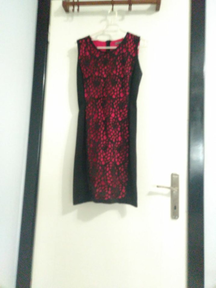 Suni kumaştan, kolsuz ve V yaka, kırmızı-siyah batik desenli, dantelli, vücuda oturan midi kadın elbisesi.