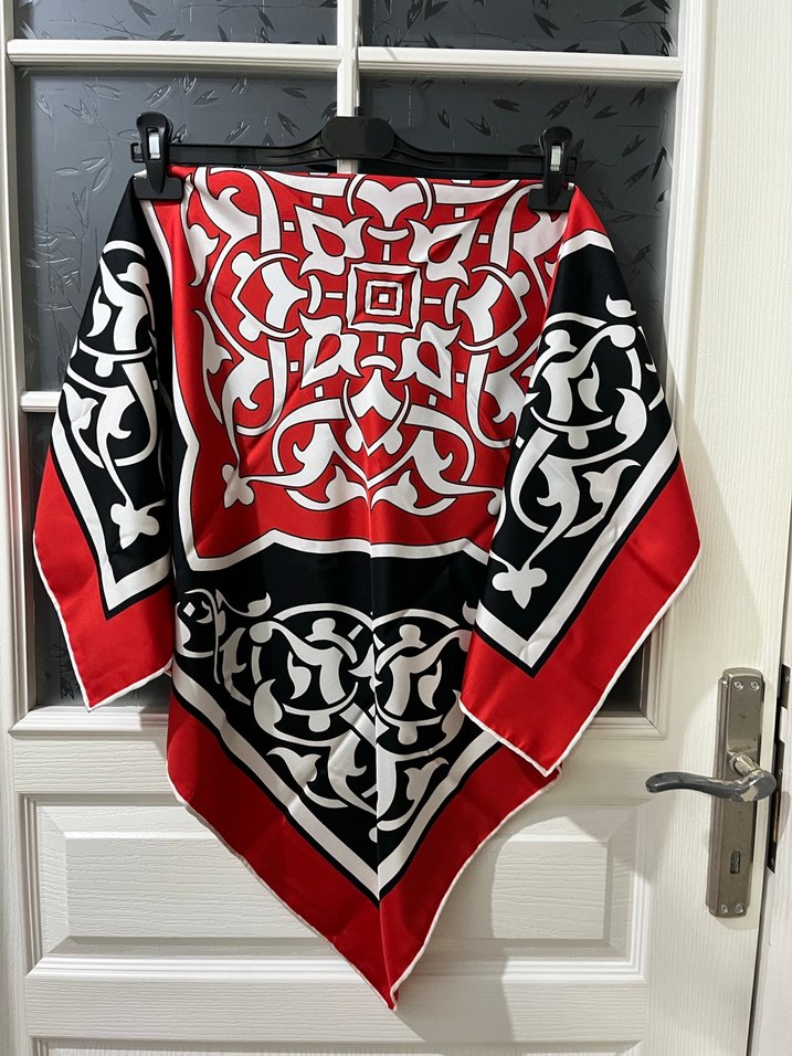 Kadınlar için kırmızı ve siyah desenli, sentetik kumaştan yapılmış, drapeli eşarp. Bohem ve retro Paris tarzını yansıtır.
