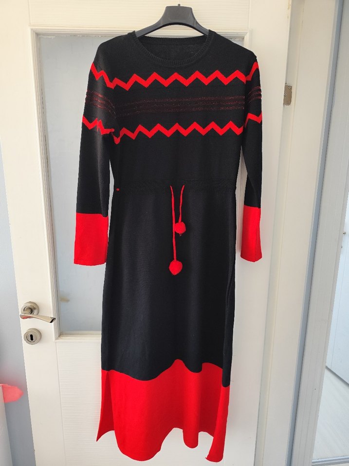 Kırmızı ve siyah renklerde desenli, uzun ve ince triko elbise. Yuvarlak yaka, uzun kollu ve belinde bağcıklı detay bulunur. Günlük kullanıma uygun, rahat bir model.