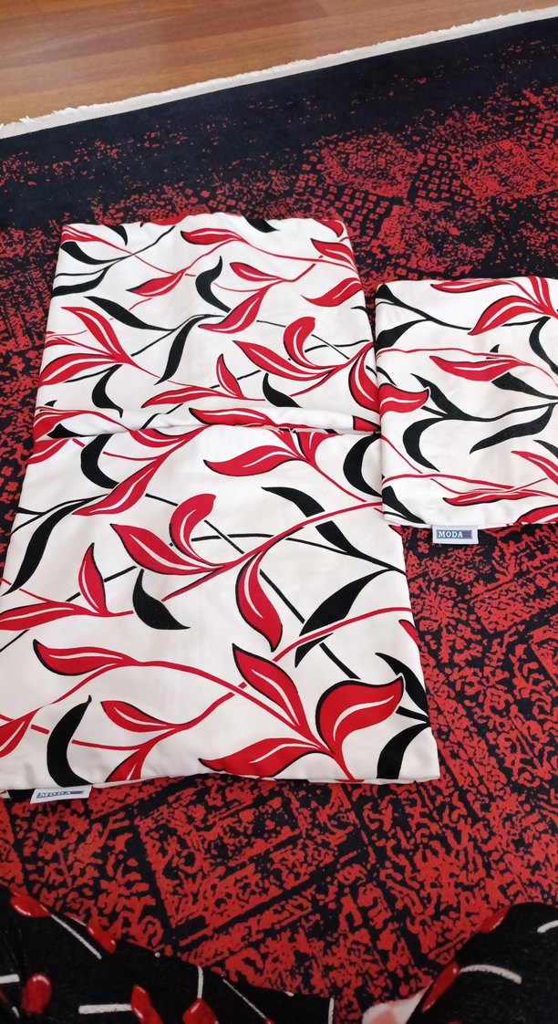 Yumuşak kumaştan yapılmış, kırmızı ve siyah yaprak desenli renkli yastık ve yastık kılıfı seti. Yatak odanıza canlılık katar. ️bırınde leke vardır