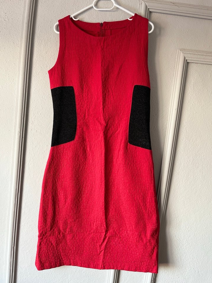 Koyu kırmızı, siyah detaylara sahip , fermuarlı sırt detaylı, yumuşak dokulu kolsuz midi elbise. Abiye bi elbise. Mezuniyetlerde kullanılabilir