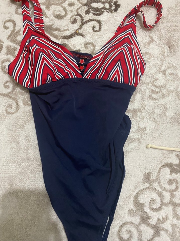 Kadınlar için askılı, drapeli ve vücuda oturan kesime sahip mayo. Üst kısmı koyu kırmızı desenli, alt kısmı siyah renkte, plaj ve sokak stiline uygun.