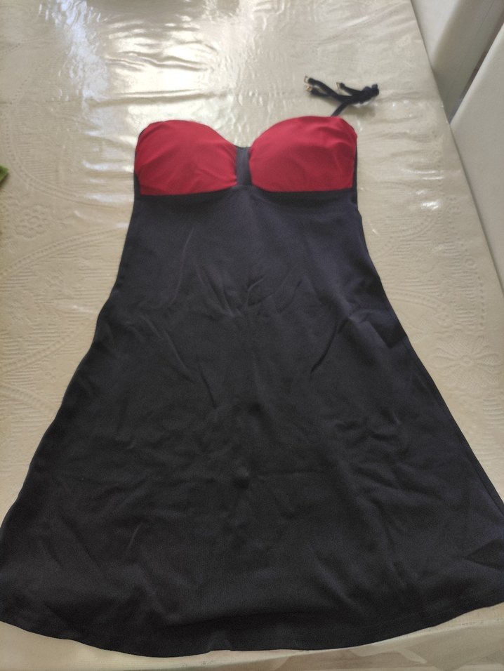 Kırmızı bustiyer ve siyah drapeli midi etekten oluşan, dar kesim ve kolsuz kadın mayosu. Minimalist gotik tarzda, günlük kullanıma uygun.