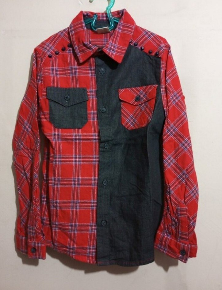 Çocuk gömlek, uzun kollu ve düğmeli, kırmızı ekose ile siyah düz kalın ve pamuk kumaş kombinli. Notlu yaka, iki cep, günlük rahat kullanım için uygun. Uzunluk 48, göğüs 36, kol omuzdan 47 cm 6-7 yaşa uygun.