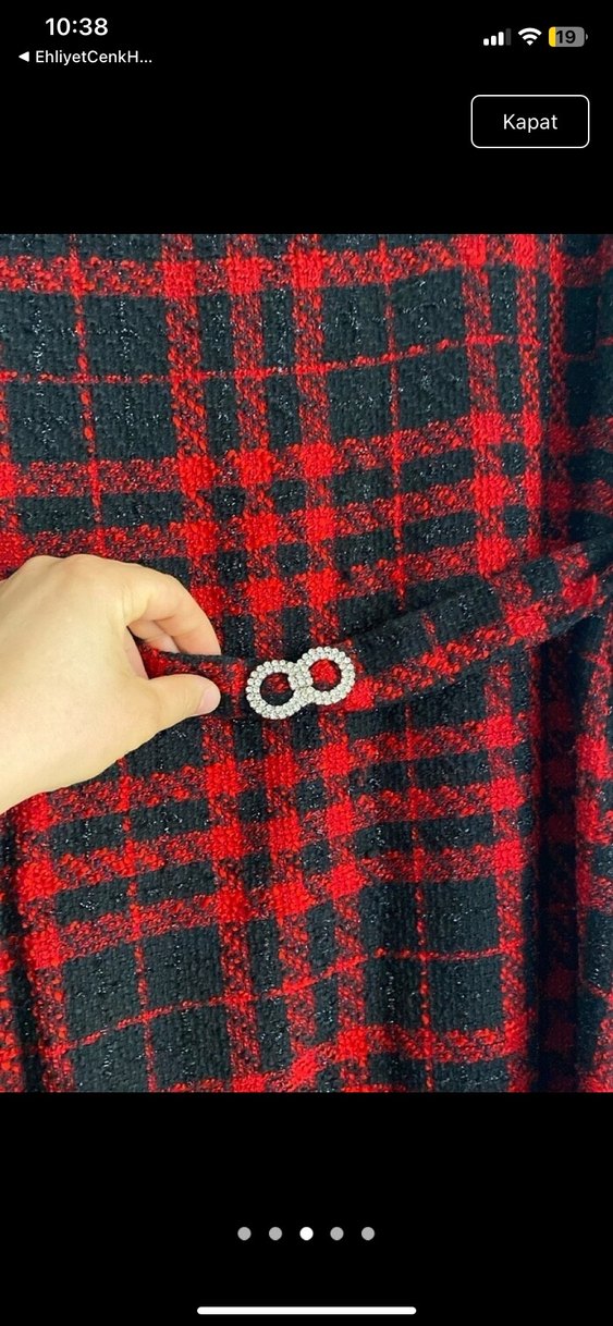 Koyu kırmızı ve siyah ekose desende, düğmeli kadın broşu. Rahat ve rock punk tarzıyla günlük kullanıma uygun.