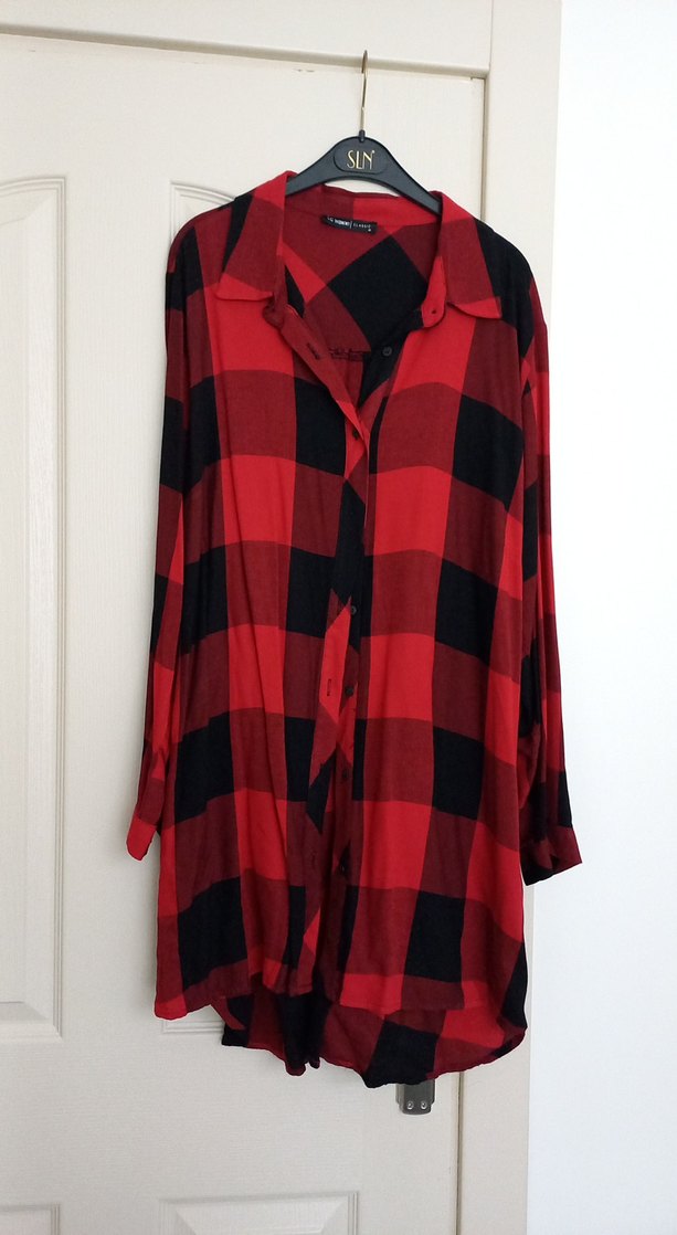 Kırmızı siyah ekose desenli, düğmeli, yakalı, uzun kollu, bol kesim gömlek. Günlük kullanıma uygun tekstil kumaştan yapılmıştır.
