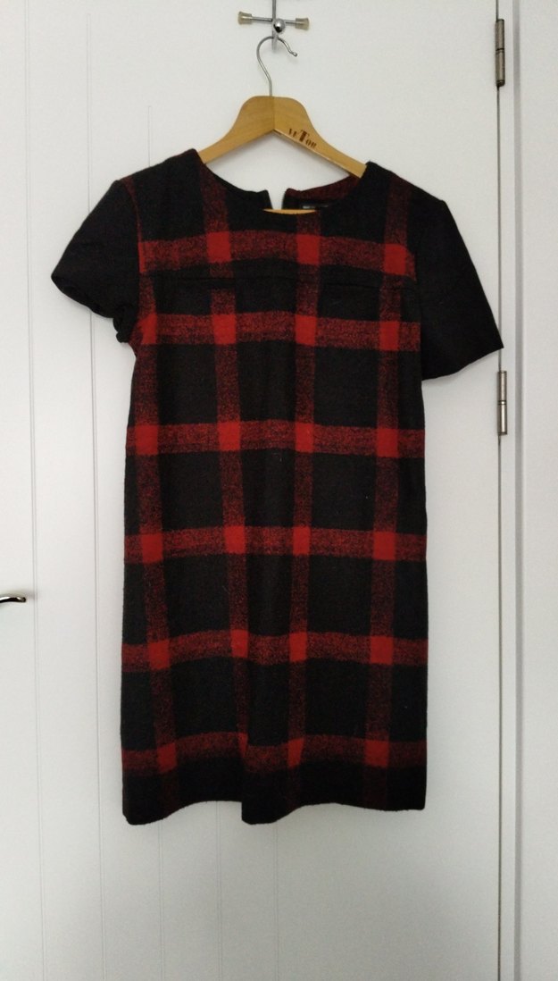 Kırmızı siyah ekose desenli, kısa kollu, düğmeli yaka detaylı yün midi elbise. Rahat kesimli, sokak tarzına uygun, günlük kullanıma ideal.