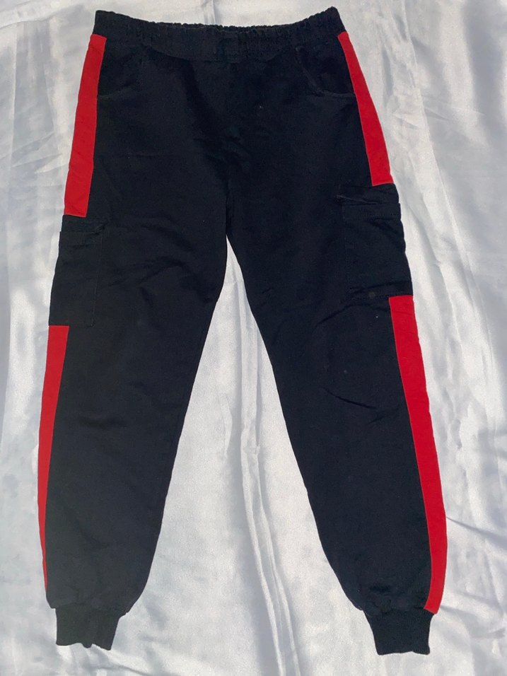 Kırmızı yan şeritler ve cep detaylı, yumuşak ve sıcak kumaştan üretilmiş erkek rahat kesim eşofman.