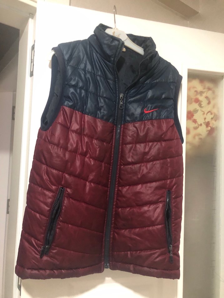 Kırmızı siyah renkte, fermuarlı cepli, yüksek yakalı, dar kesim erkek şişme yelek. Rahat sokak stiline uygun.