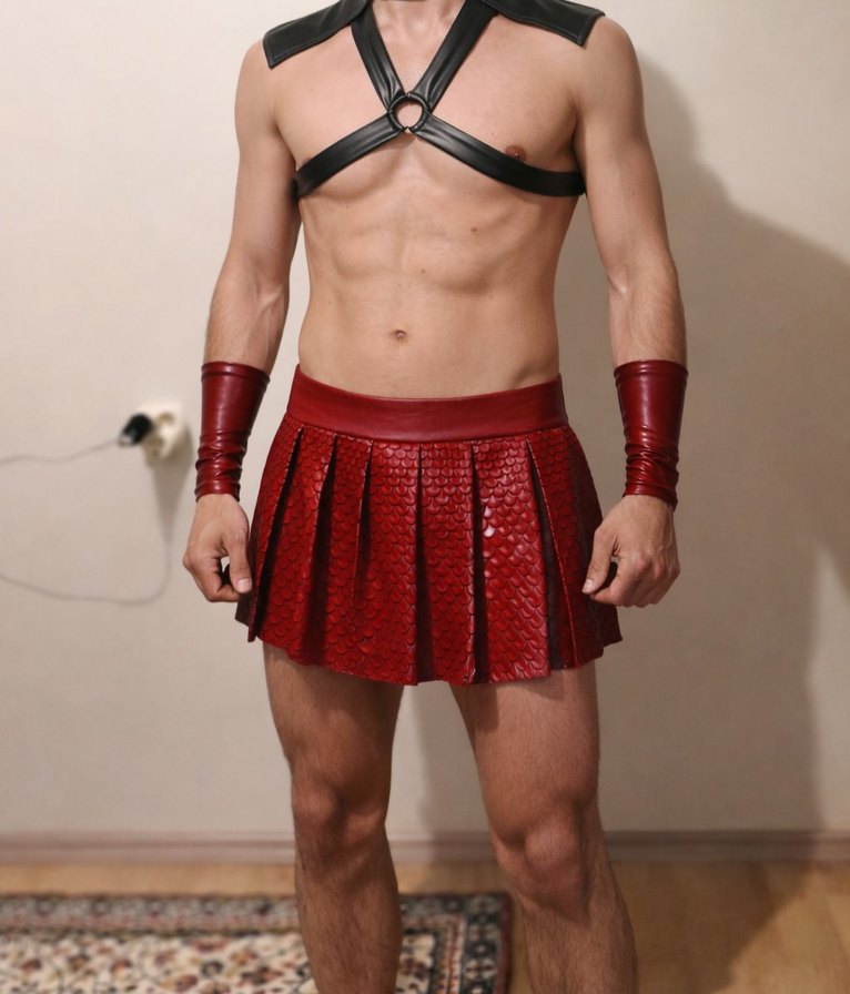 Koyu kırmızı yılan baskılı, kısa mini boy ve vücuda oturan kesime sahip avant-garde tarzda erkek kostüm.