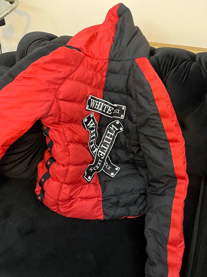 Fermuarlı, yüksek yakalı ve uzun kollu kırmızı-siyah erkek kışlık mont. Baskılı detaylı, spor ve rock punk tarzında, yumuşak ve sıcak kumaştan, midi boyda.