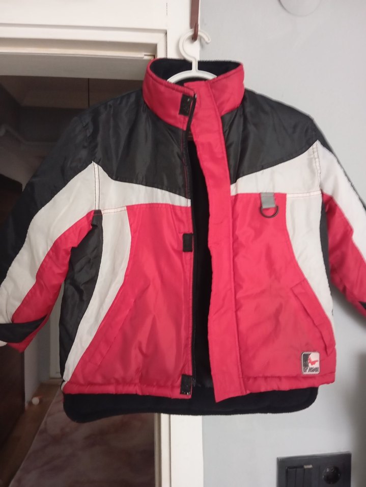 Fermuarlı, notched lapel yakalı, fitted biker tarzında kırmızı-siyah-beyaz renklerde erkek çocuk ceketi. Sıcak tutan kumaştan üretilmiştir.