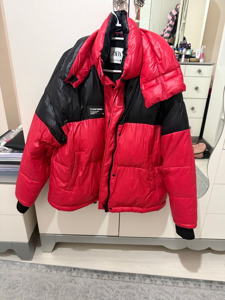 Kırmızı siyah renklerde, fermuarlı ve yüksek yakalı, uzun kollu, yumuşak kumaştan, günlük sokak stili için uygun kadın kışlık mont. İade almıyorum