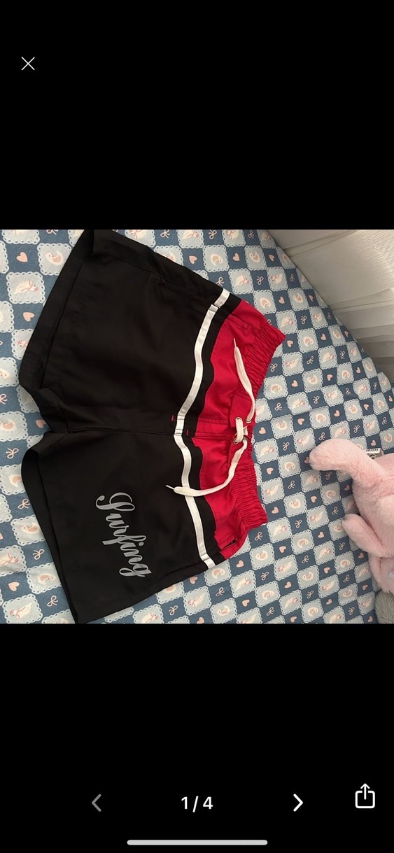 Kırmızı ve siyah renklerde, baskılı detaylı, fermuarlı cepli ve fit kesimli kadın mini şort, plaj kullanımı için uygundur.