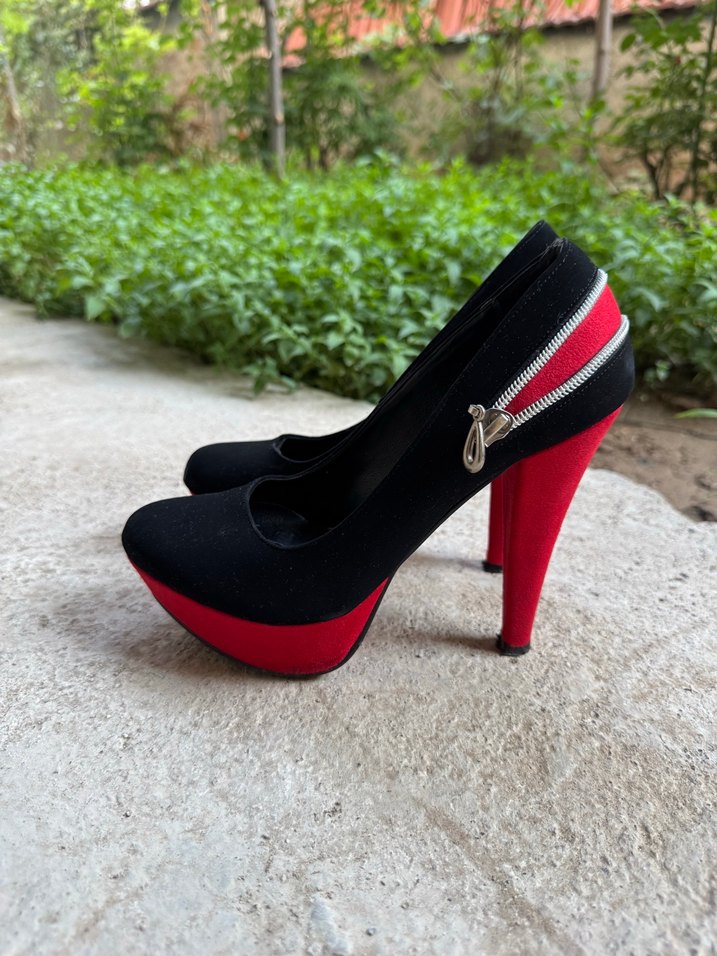 Kırmızı Siyah Fermuarlı Platform Topuklu Ayakkabı