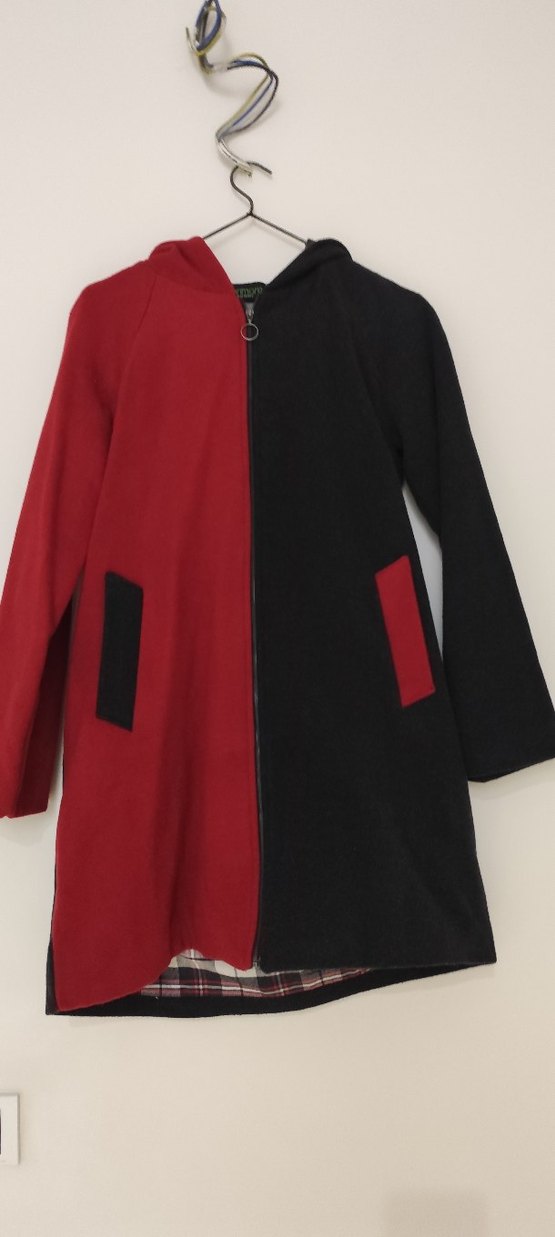 Kırmızı ve siyah renk bloklu, fermuarlı, uzun kollu kaban. Rahat kesim ve yumuşak, sıcak kumaştan üretilmiştir. Günlük kullanıma uygundur.