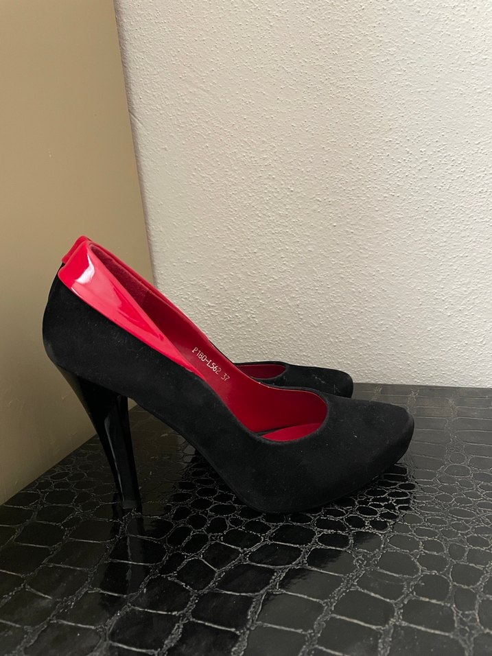 Kadınlar için yüksek topuklu, koyu kırmızı ve siyah renkte gotik stilettolar. Kauçuk malzemeden, tokalı detaylı, romantik akşamlar için uygun. ❤️