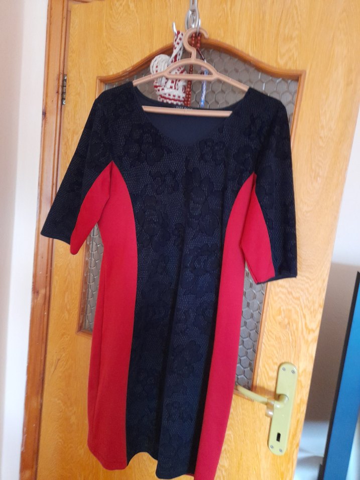 Kırmızı ve siyah renklerde, kısa kollu, yuvarlak yakalı, bol kesim hamile midi tunik. Bohem Paris tarzında, günlük kullanıma uygun.