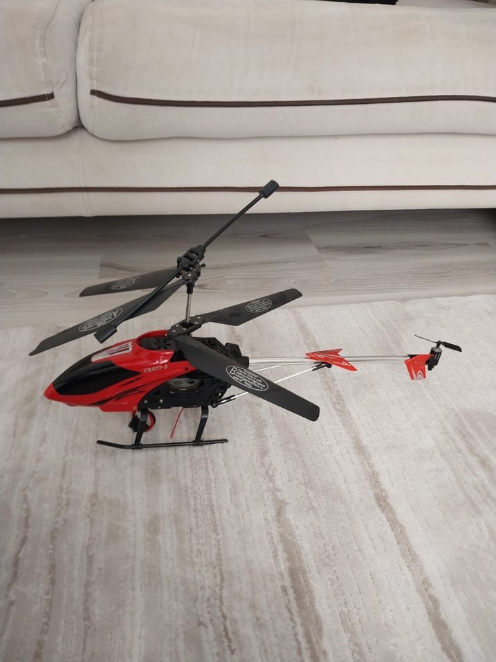 Karanlık kırmızı ve siyah renkte, dönen pervanelere sahip oyuncak helikopter.Kumandalı
