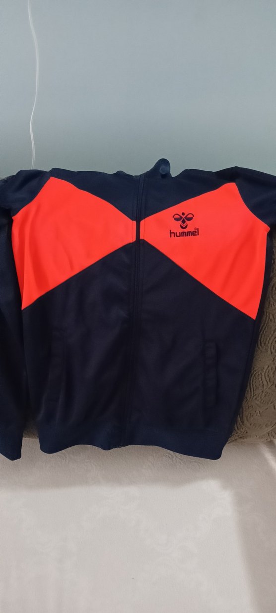 Hummel markalı, fermuarlı ve yüksek yakalı erkek çocuk ceketi. Yumuşak ve sıcak dokulu kumaştan, kırmızı ve siyah renklerde, baskılı desenli, şık ve rahat.orjinal temiz xs beden
