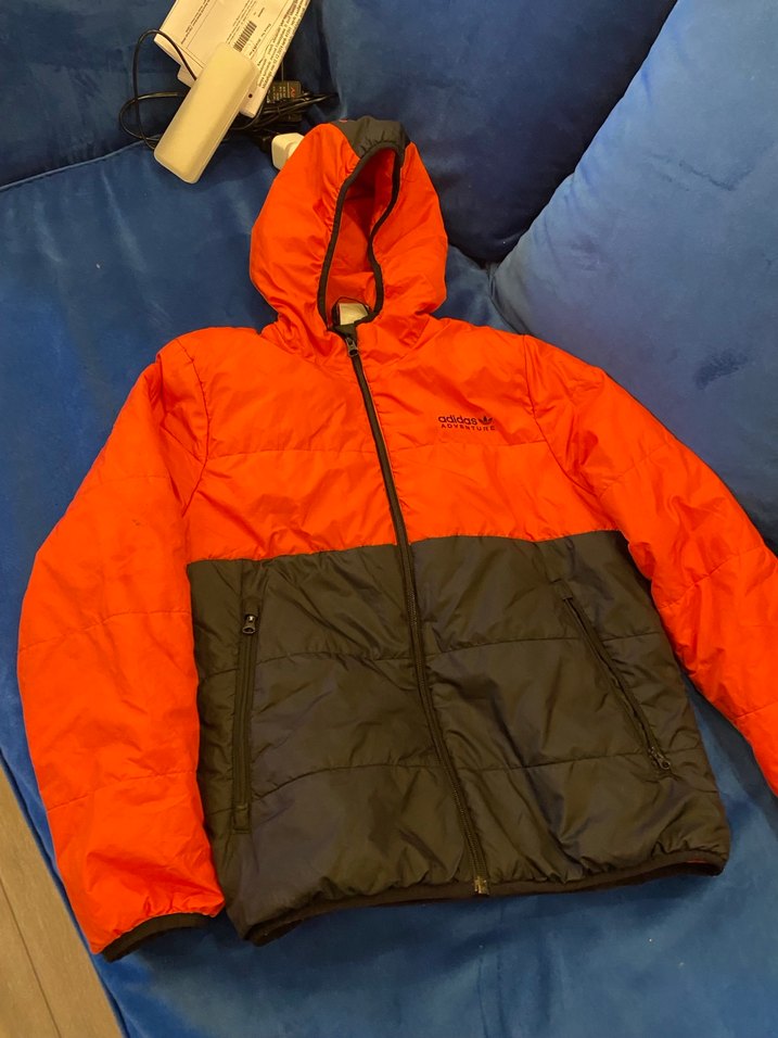 l beden çocuk Fermuarlı cepli, kapüşonlu ve fitted kesim erkek çocuk mont. Turuncu ve koyu renklerin birleşimi, yumuşak ve sıcak kumaşla sokak tarzı için uygun.