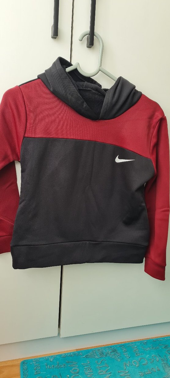 Fitted kesim, kapüşonlu ve uzun kollu erkek sweatshirt. Yumuşak fleece kumaştan, koyu kırmızı ve siyah renklerde, örme dokulu, Nike logosu detaylı. Yumusacik kalin bir yapisi var, sicacik tutuyor, bordo siyah renginde, sorunsuz..