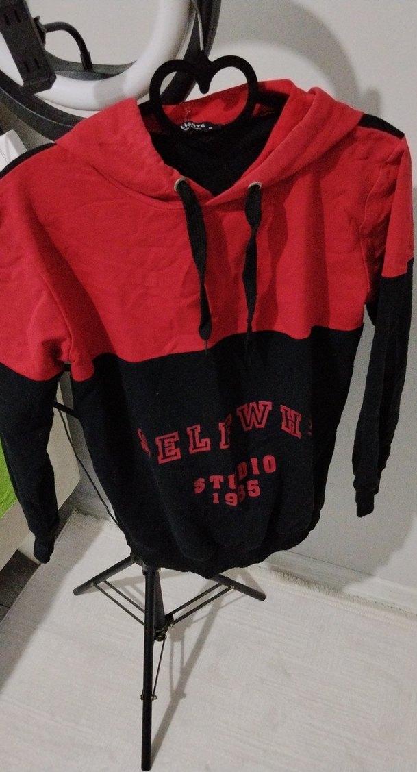 Kadınlar için uzun kollu, kapüşonlu ve bol kesim sweatshirt. Kırmızı ve siyah renk bloklu, baskılı detaylı ve fermuarlı. Yumuşak sentetik kumaştan, günlük kullanıma uygun. S ve M beden uyumlu