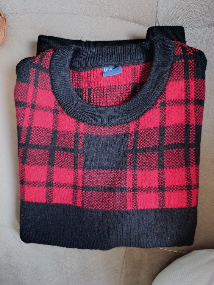 Kırmızı ve siyah kareli desenli, yuvarlak yaka ve uzun kollu kadın triko kazak. Regular fit ve sentetik kumaşla rahat ve günlük kullanıma uygun.