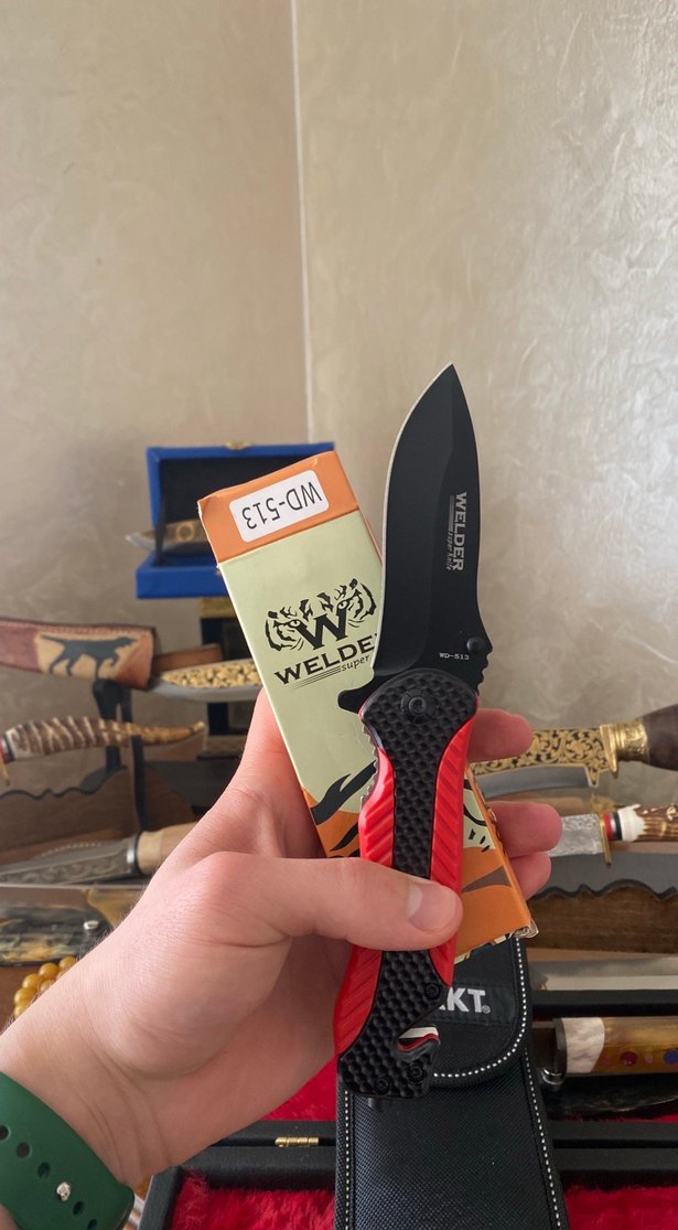 Kırmızı siyah dokulu saplı katlanır bıçak. Üzerinde 'WELDE' ve diğer işaretler bulunur. Markalı kutusunda.