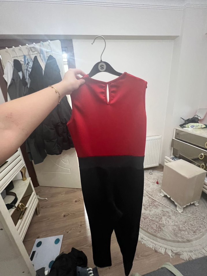 Kırmızı ve siyah renklerde, v yaka ve kolsuz, midi boy, dar kesim kadın tulumu. Sentetik kumaştan, günlük ve sokak stiline uygun.