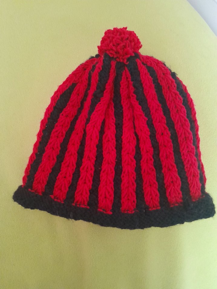 Kırmızı ve siyah çizgili, üstü ponponlu örgü kadın bere, yumuşak triko kumaştan yapılmıştır.