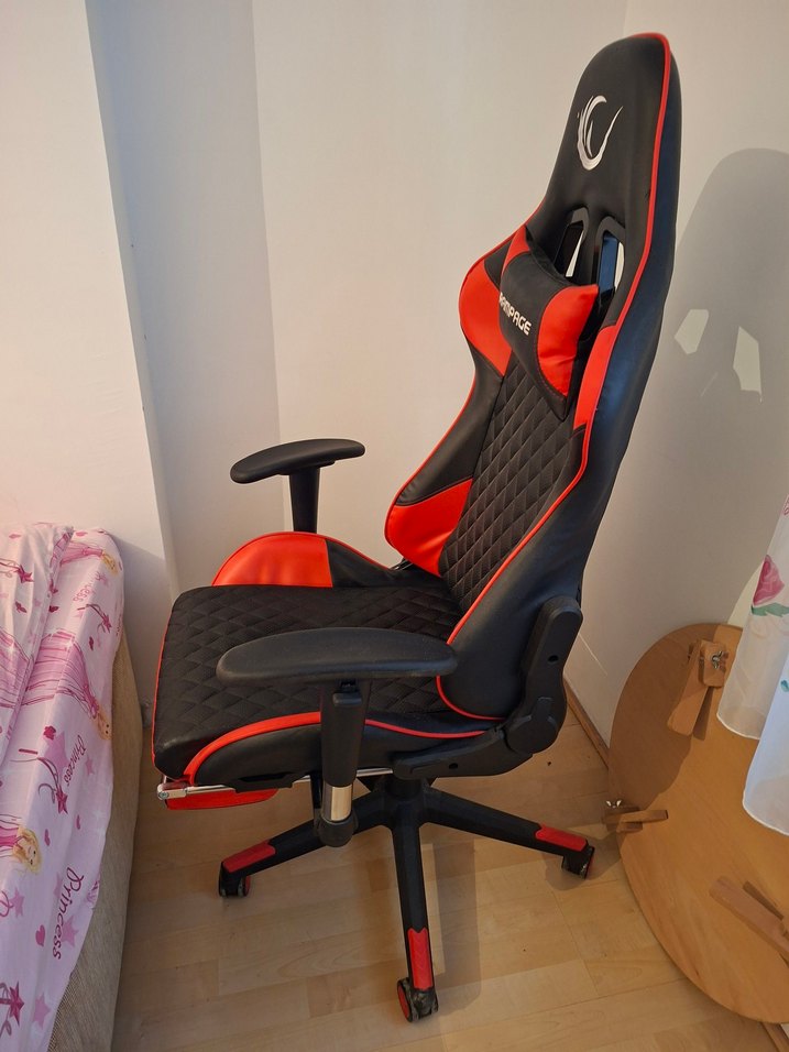 Kırmızı ve siyah yastıklı, ayarlanabilir kolçaklı, yüksek sırtlı oyuncu koltuğu. Boyun yastığı ve tekerlekli sağlam taban içerir. sehir disina ucreti alici öder