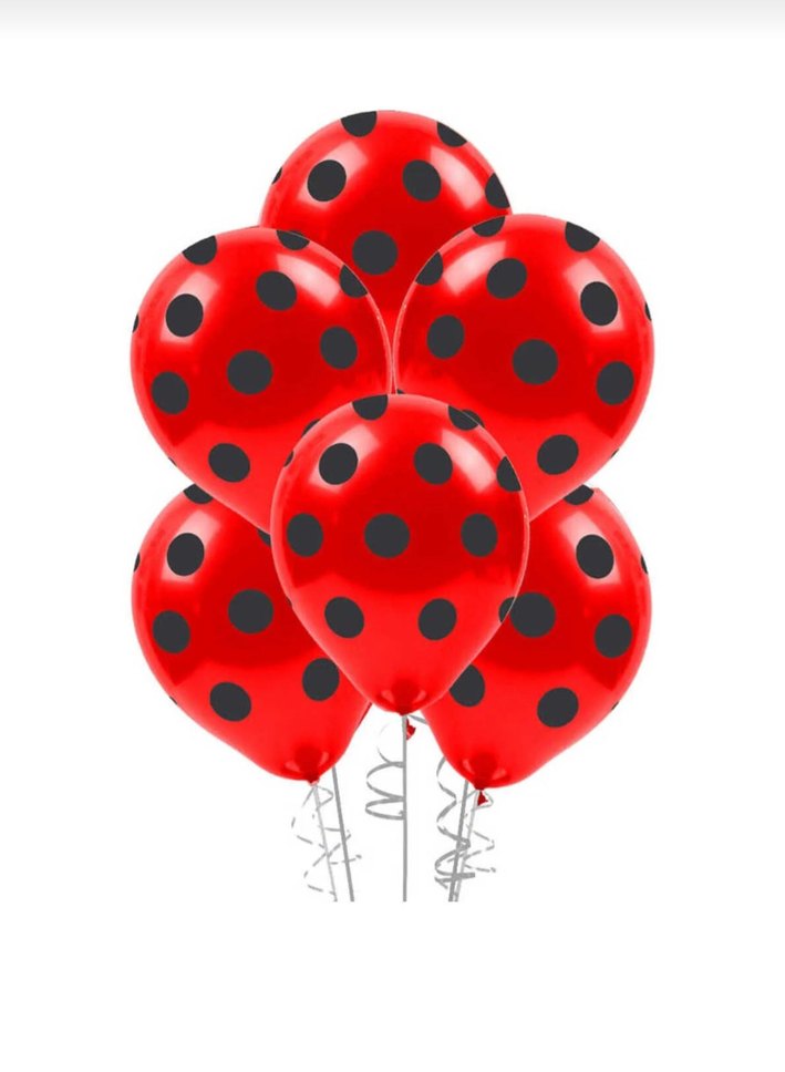 26 adet puantiyeli balon. Yeni kullanılmamıştır.Kırmızı balonlar siyah puantiyelerle süslenmiş, renkli parti süslemeleri için uygun.