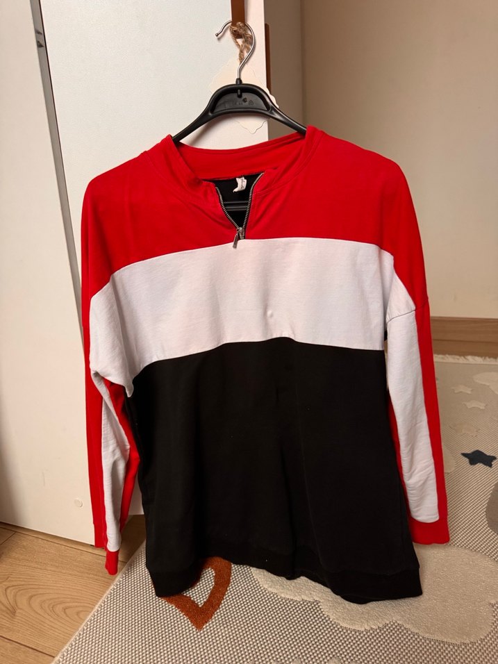 Uzun kollu, yuvarlak yaka ve fermuarlı detaylı sweatshirt. Kırmızı, beyaz ve siyah renk bloklu, bol kesim ve yumuşak sıcak kumaştan.