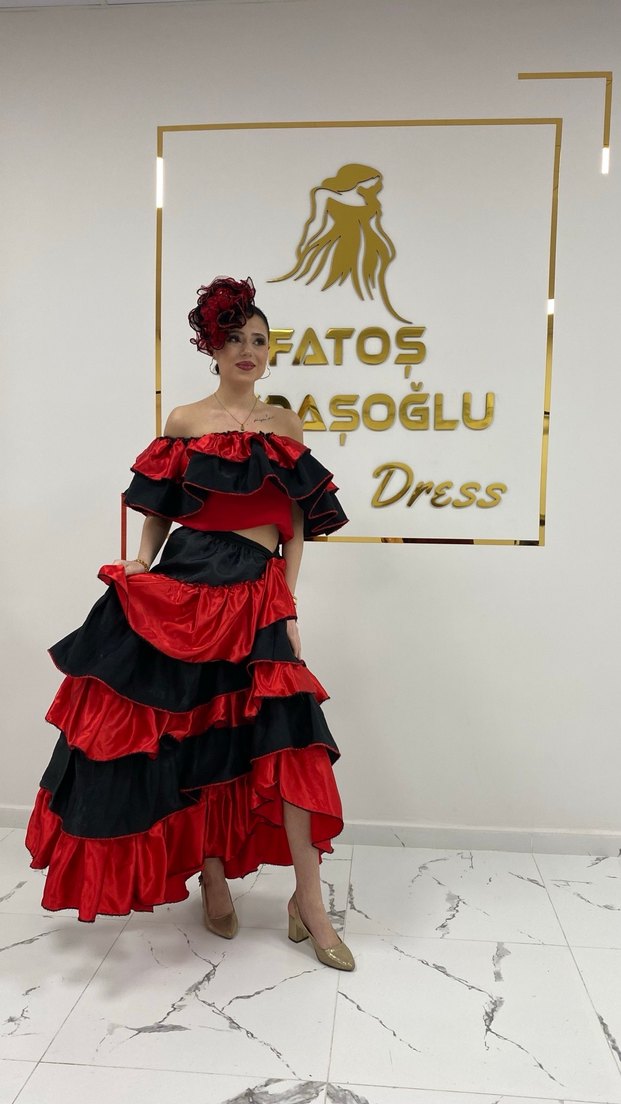 Bu cesur bohem abiye elbise, askısız yaka ve etnik desenli, kırmızı-siyah fırfırlarla bol kesim olarak tasarlanmıştır. Parti için uygundur.