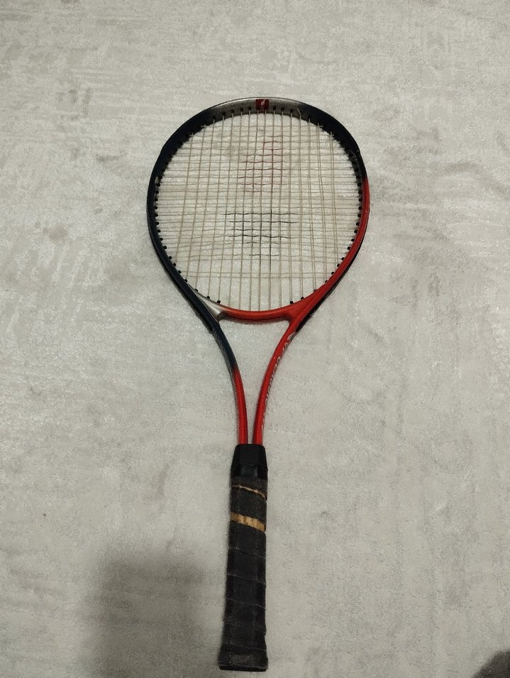 Koyu kırmızı ve siyah çerçeveli, dokulu saplı tenis raketi. kılıfı mevcut sayılı kullanıldı