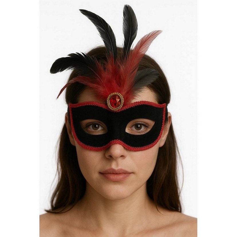 Kırmızı kenarlıklı siyah maske, ortasında kırmızı taş ve çeşitli renklerde tüy detayları bulunur.
