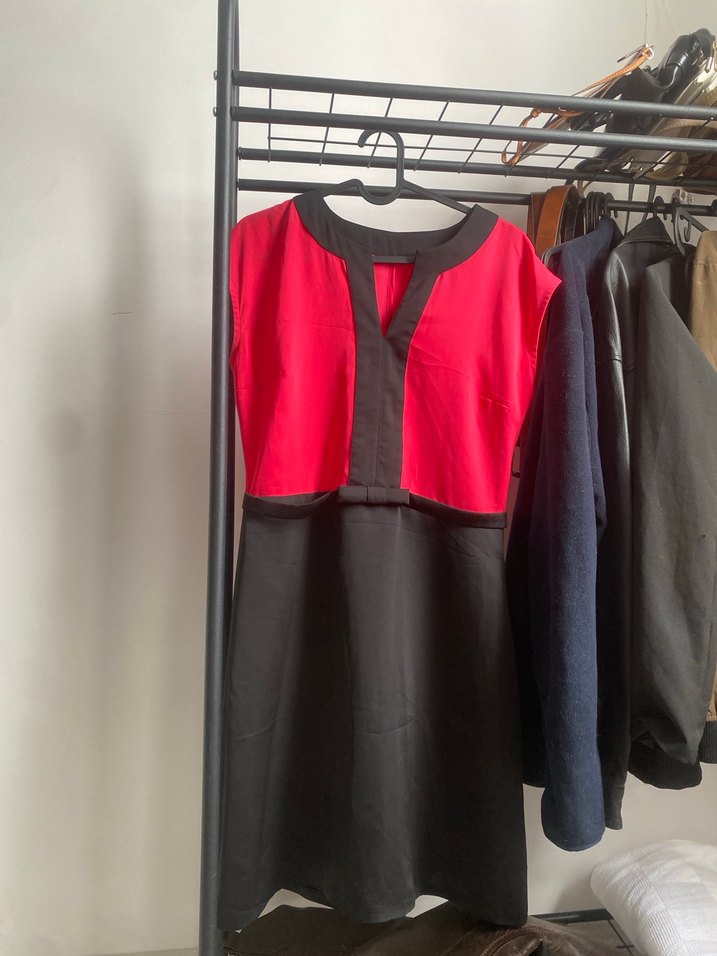 Kemer detaylı, kolsuz ve V yaka kesime sahip bu hamile elbisesi, kırmızı ve siyah renkleriyle modern bir ofis şıklığı sunar.
