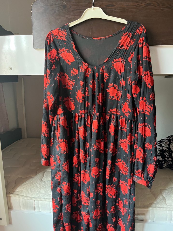 Uzun, bol kesim elbise, V yakalı ve uzun kolludur. Koyu zemin üzerine kırmızı batik desenlidir. Pliseli detaylara sahip, yumuşak sentetik kumaştan bohem tarzda, günlük kullanıma uygundur.